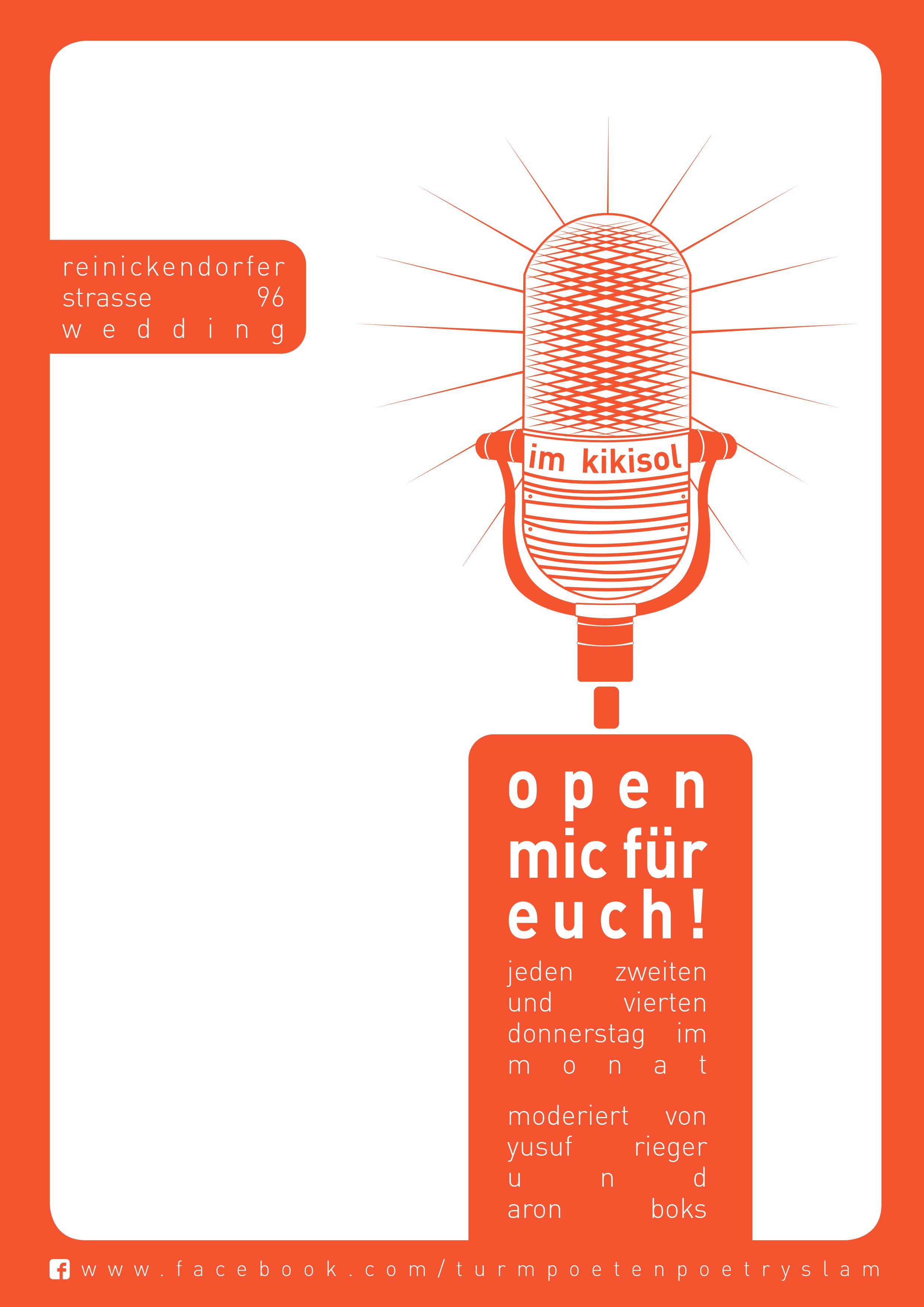 Jeden 2. und 4. Donnerstag wird es auch poetisch im KIKI SOL Wedding! Yusuf Rieger und Aron Boks moderieren für euch und mit euch das Open Mic. Jeder kann und jeder darf!